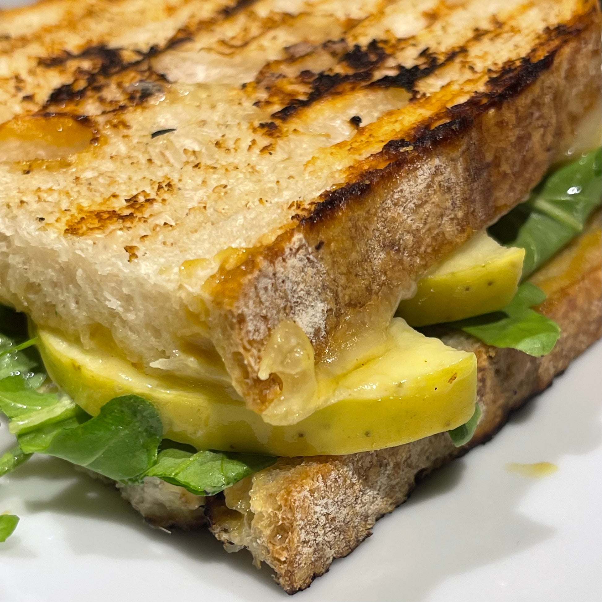 Country white sourdough, Tulima apples, cheddar cheese, honey-Dijon, arugula.