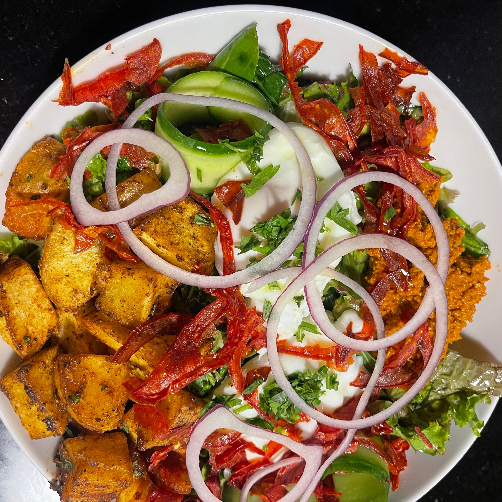 Seasonal greens & kale, sundried tomatoes, red onion, cucumber, 2 poached eggs, roasted potatoes, muhammara, lemon vinaigrette.