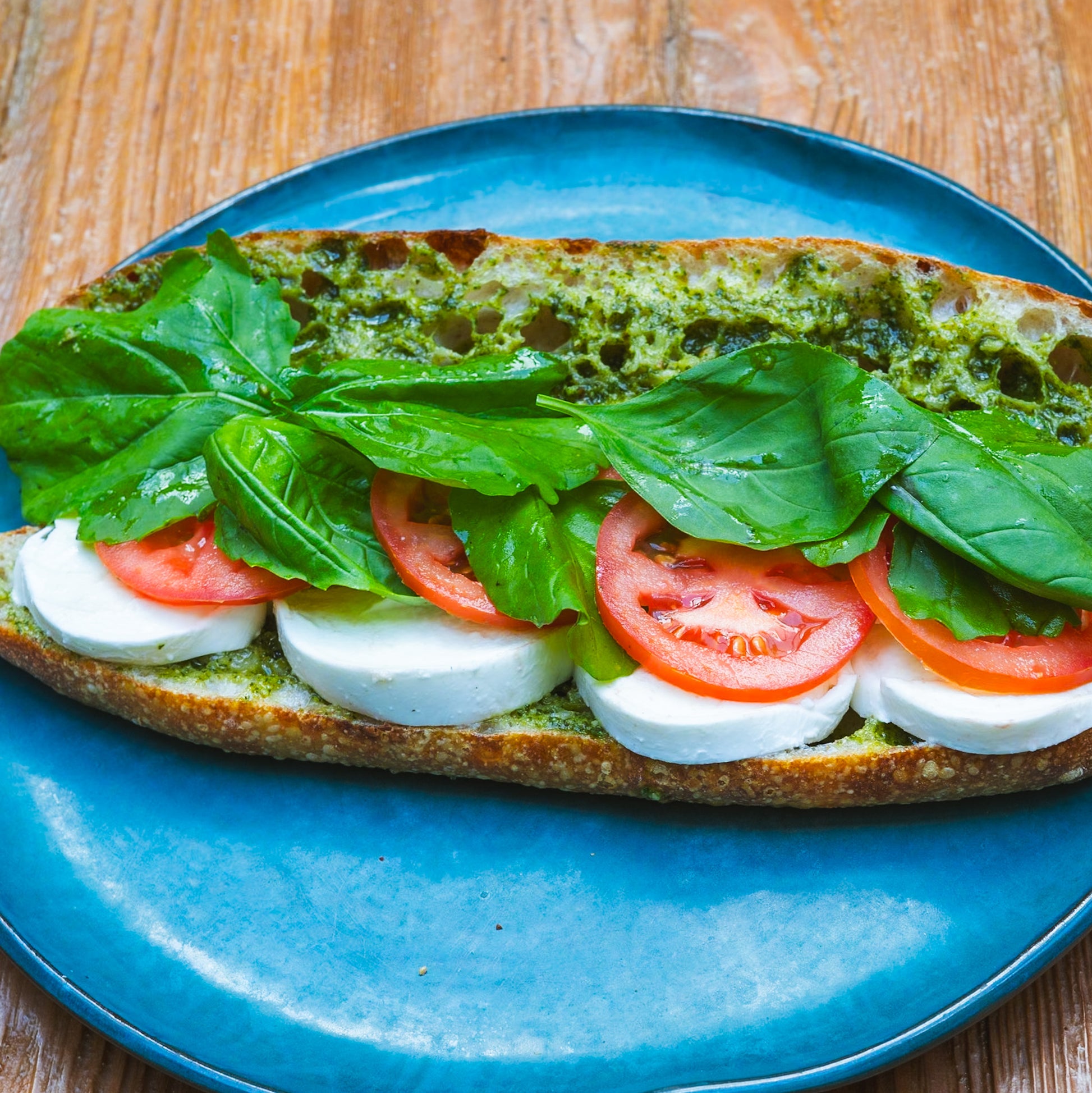 Mozzarella, fresh tomato, and our homemade basil pesto, with arugula and fresh basil leaves on sourdough baguette.