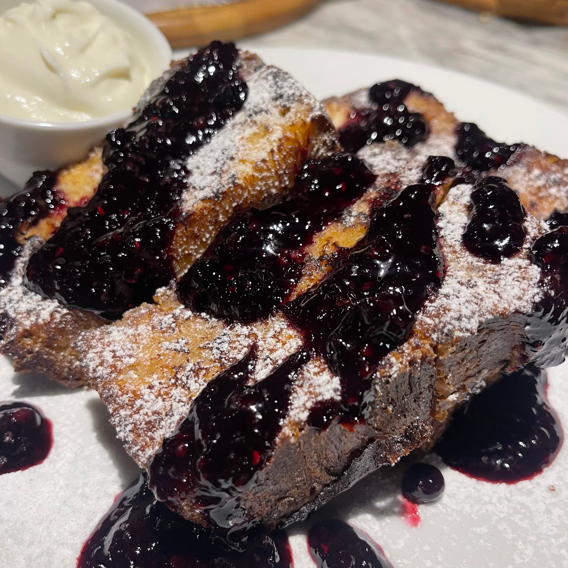 Two slices of croissant loaf, soaked in custard and cooked until golden brown. Served with a choice of whipped cream & Seasonal Fruit or French butter & pure maple syrup.
