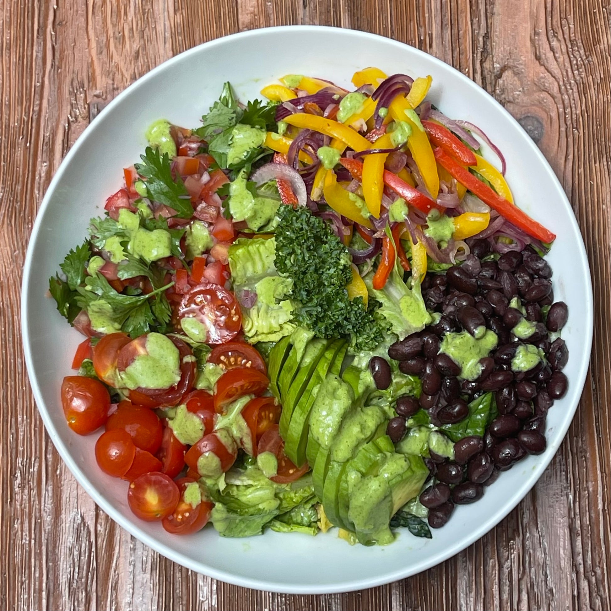Seasonal greens, black beans, sauteed peppers+ onions, cherry tomatoes, avocado, pico de gallo (tomatoes, onion, cilantro, lime,) cilantro-lime yogurt dressing.