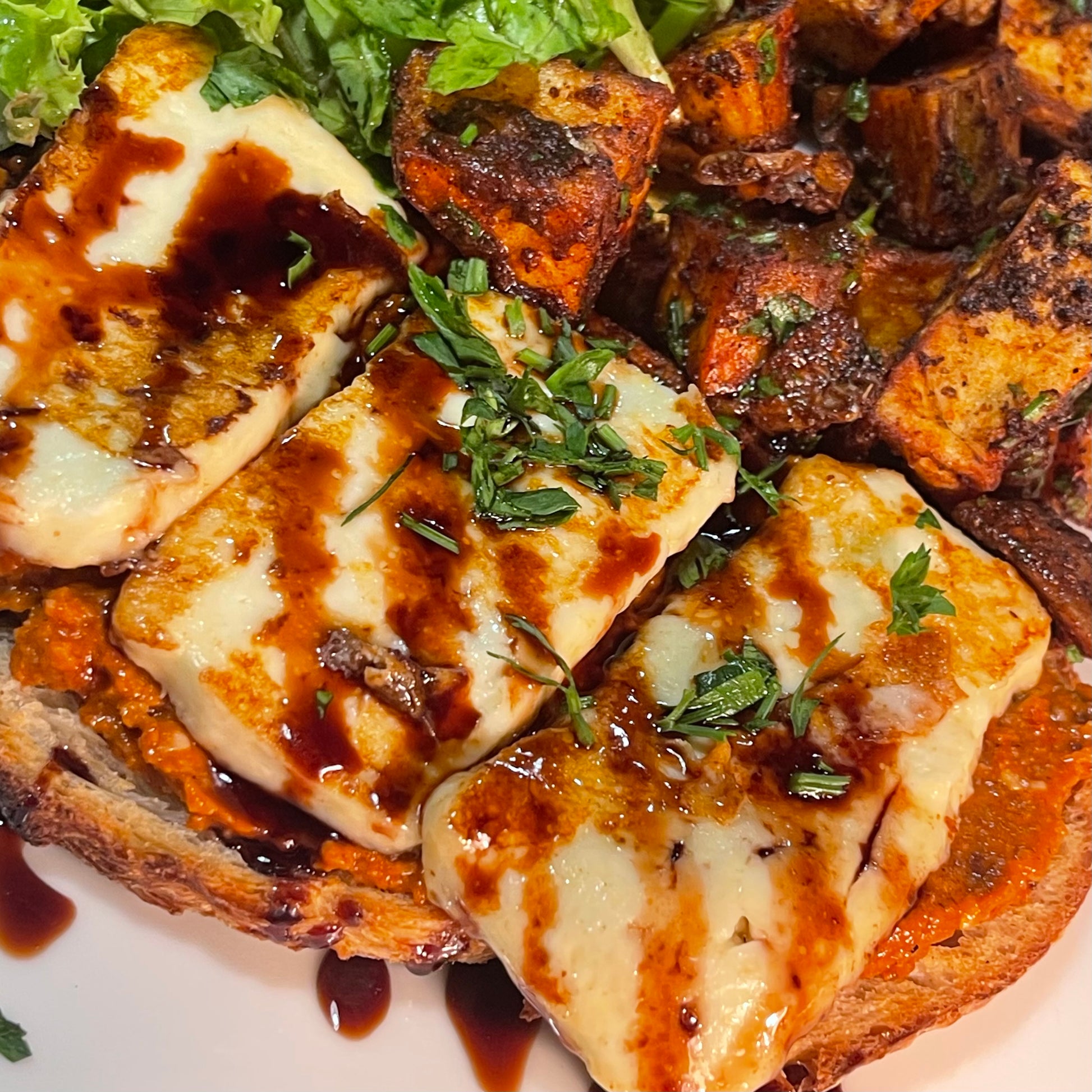Country white sourdough toast, our house-made muhammara, grilled halloumi, pomegranate glaze, chopped mint & parsley, seasonal greens.
