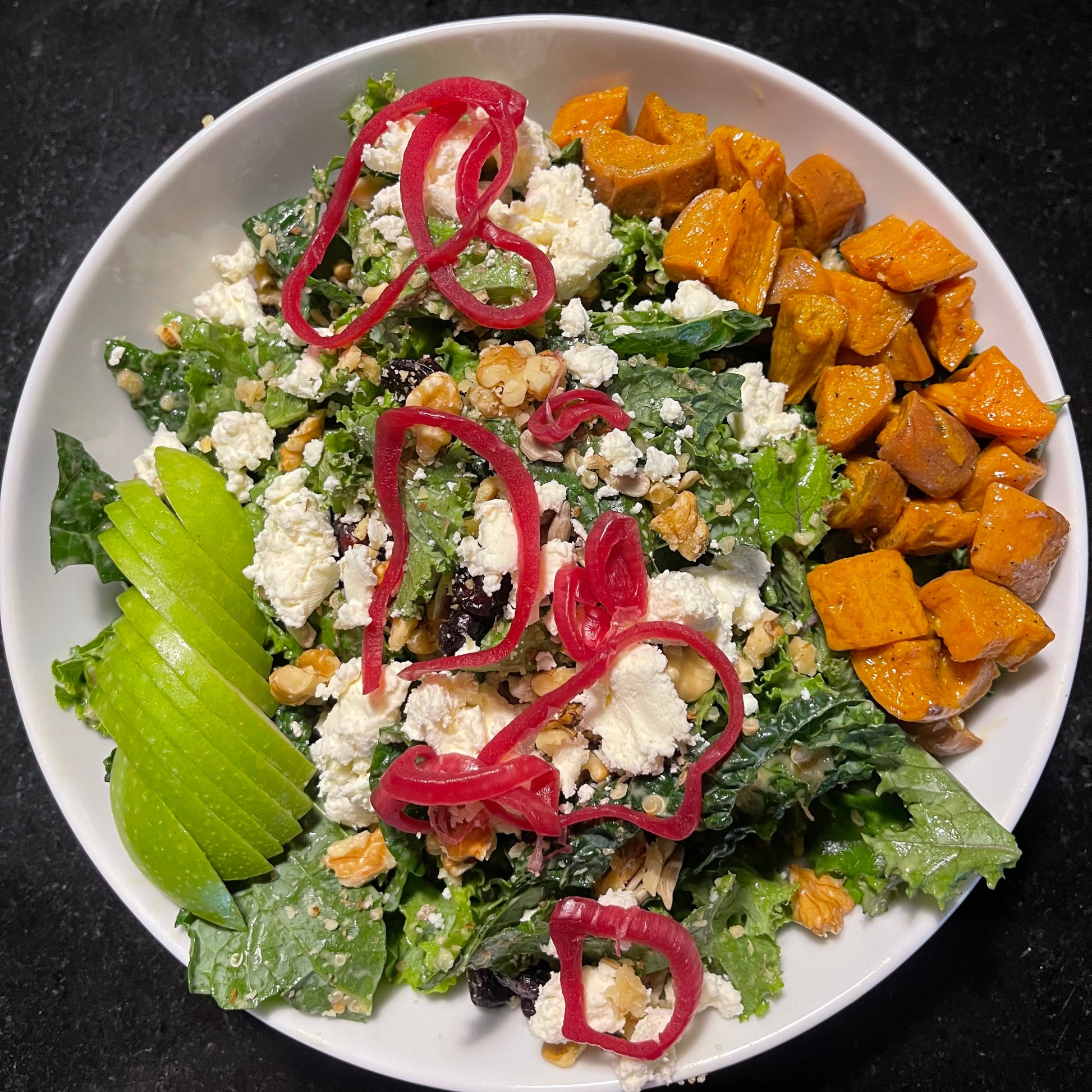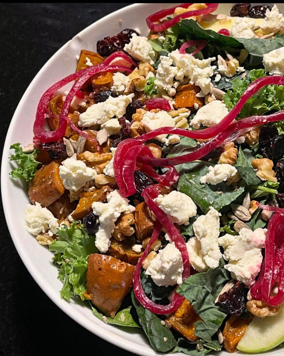 Roasted sweet potatoes, quinoa, kale, arugula, apple, dried cranberries, pickled red onion, walnuts, sunflower seeds, goat cheese & honey-mustard apple cider dressing.
