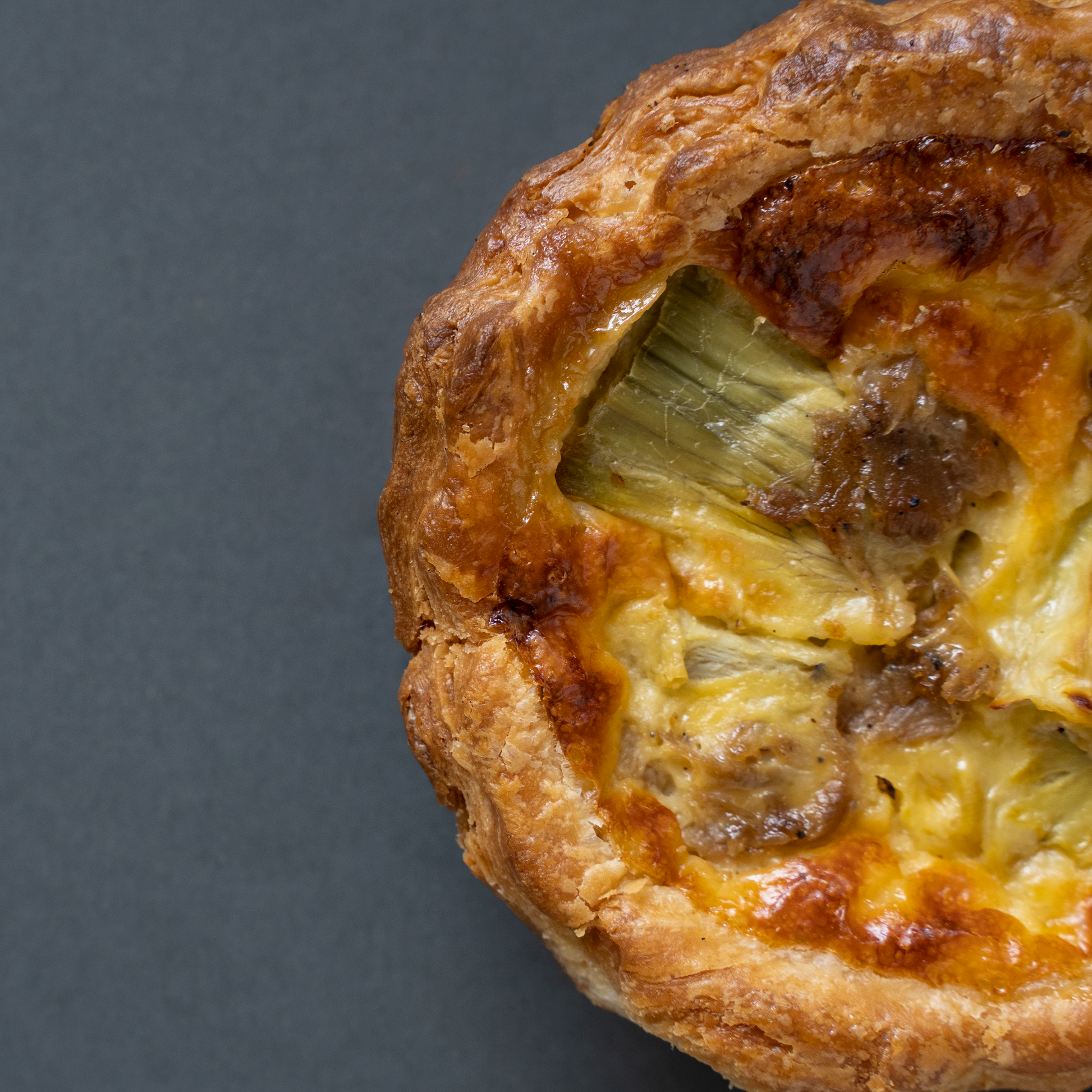 Creamy egg custard filling with sweet caramelized onions and artichoke hearts in a flaky pastry crust. .