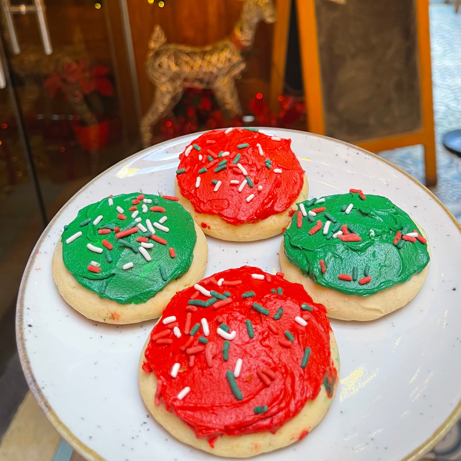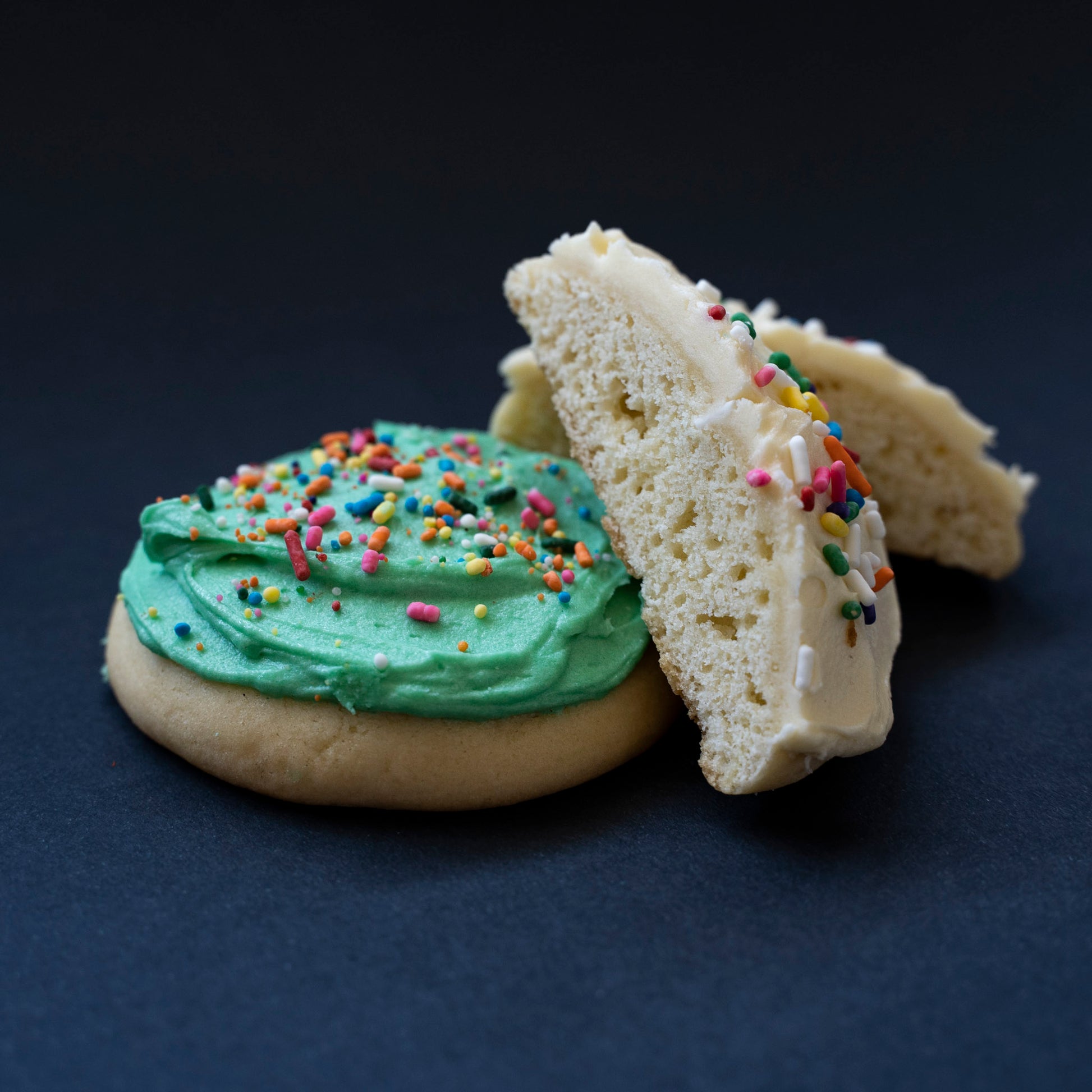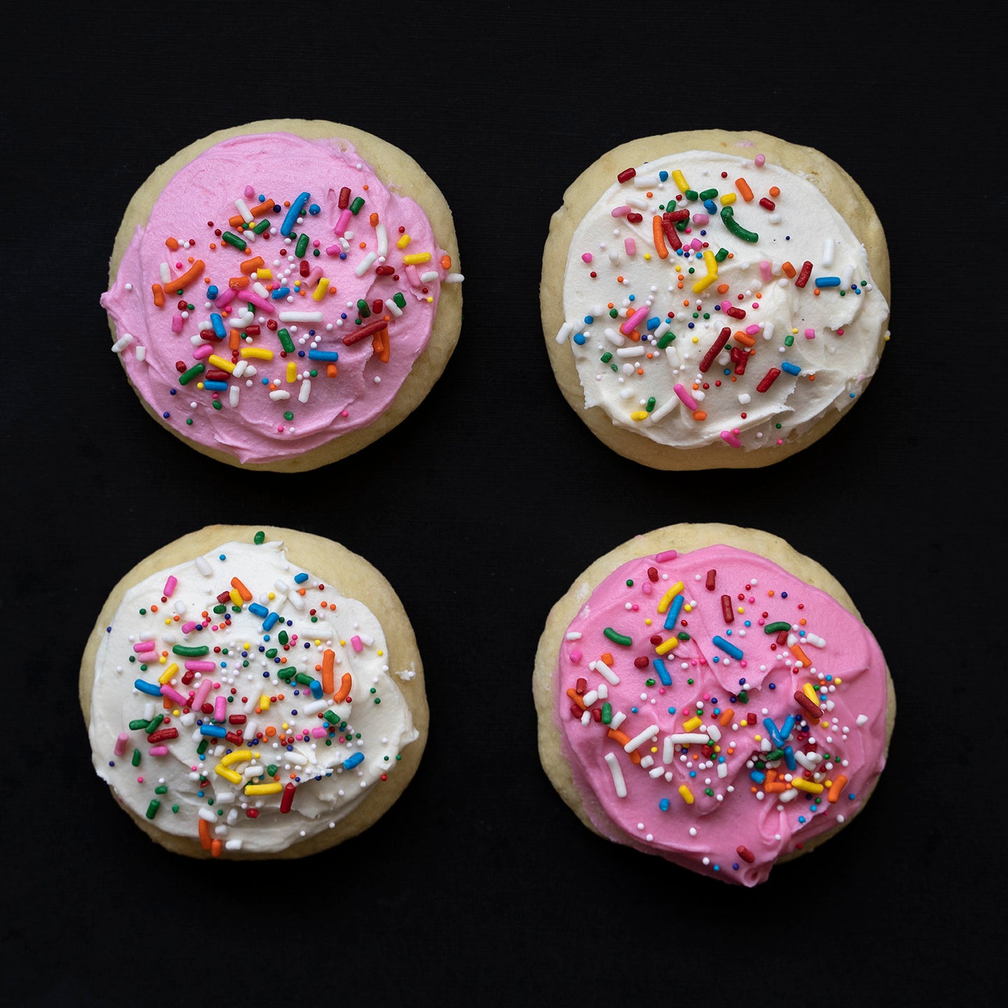 Super-soft pillowy sugar cookies topped with a thick layer of buttercream frosting and sprinkles.