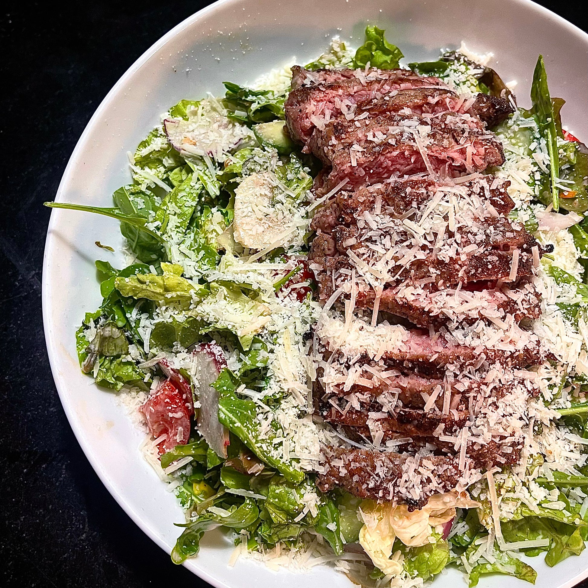 Grilled steak, greens, cucumbers, tomatoes, radishes, Parmesan shavings, Parmesan peppercorn dressing.