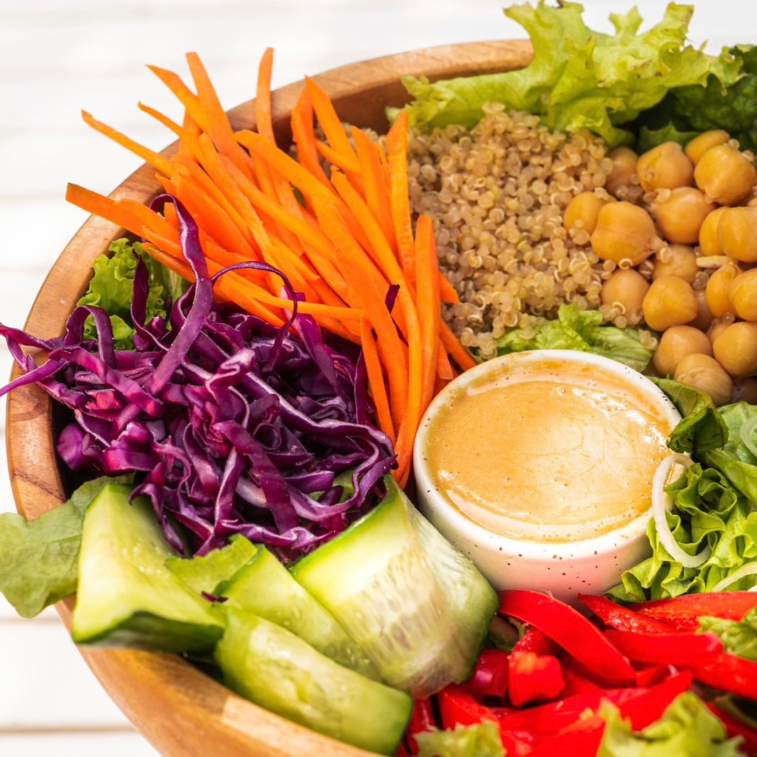 Quinoa, chickpeas, carrots, cucumbers, peppers, radishes, red cabbage, seasonal greens, mint, cilantro, peanut butter ginger-lime dressing.