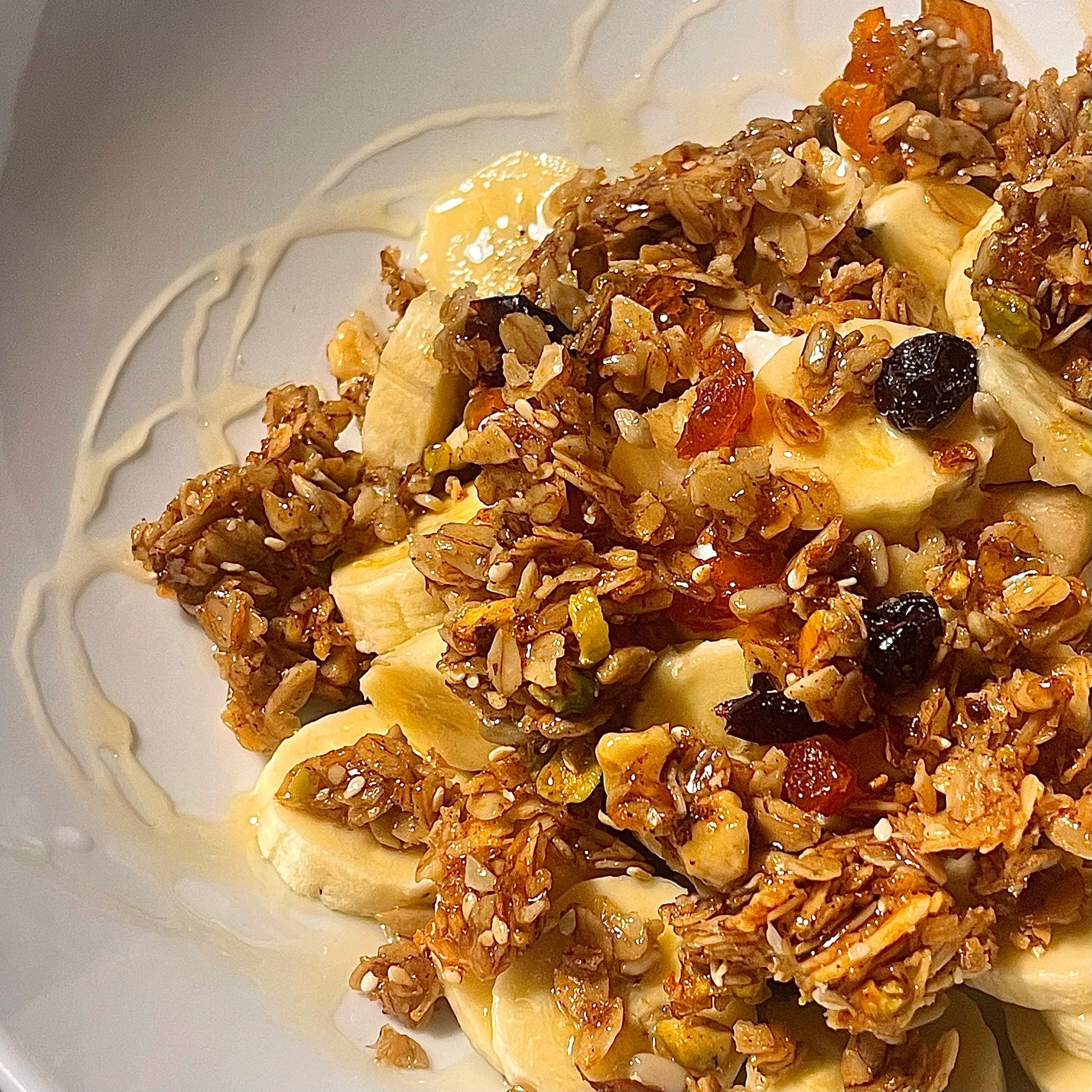 Thick Greek yogurt, granola, seasonal fruit, honey drizzle.
